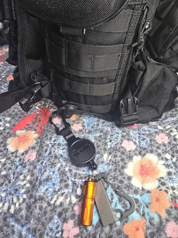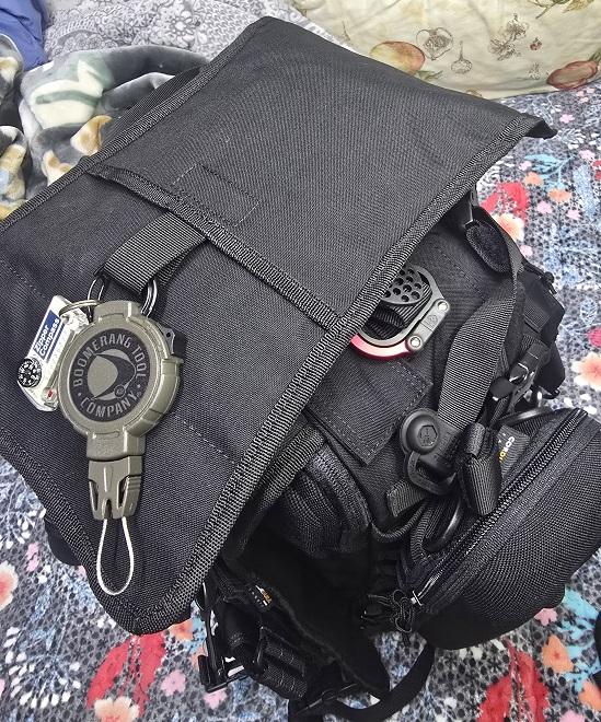 가방을 멘 상태에서도 즉시 활용가능한 오라이트 플래쉬, 호루라기, 간단한 병따개가 되는 레더맨 카라비너를 달았고