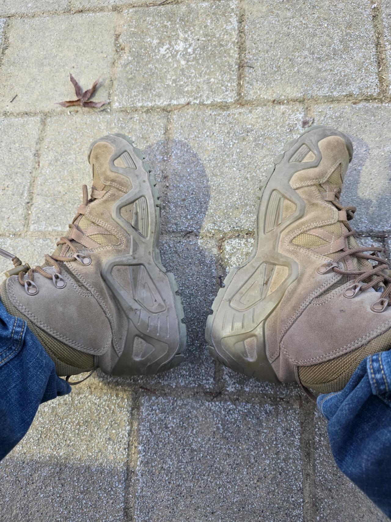 이번에 착용해 본 이 전술용 부츠(택티컬 부츠)에 대한 솔직하고 상세한 리뷰를 남겨봅니다. 사진에서 볼 수 있듯이 스웨이드 재질과 발의 측면을 감싸는 독특한 입체 프레임 디자인이 돋보이는 매우 매력적인 신발입니다.