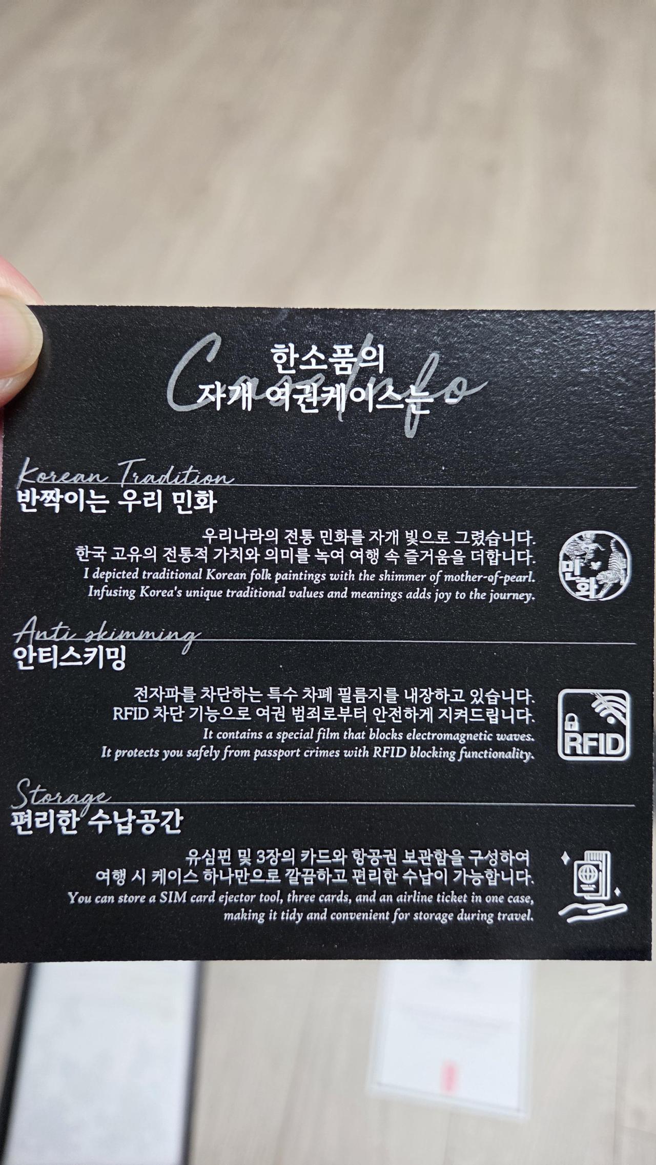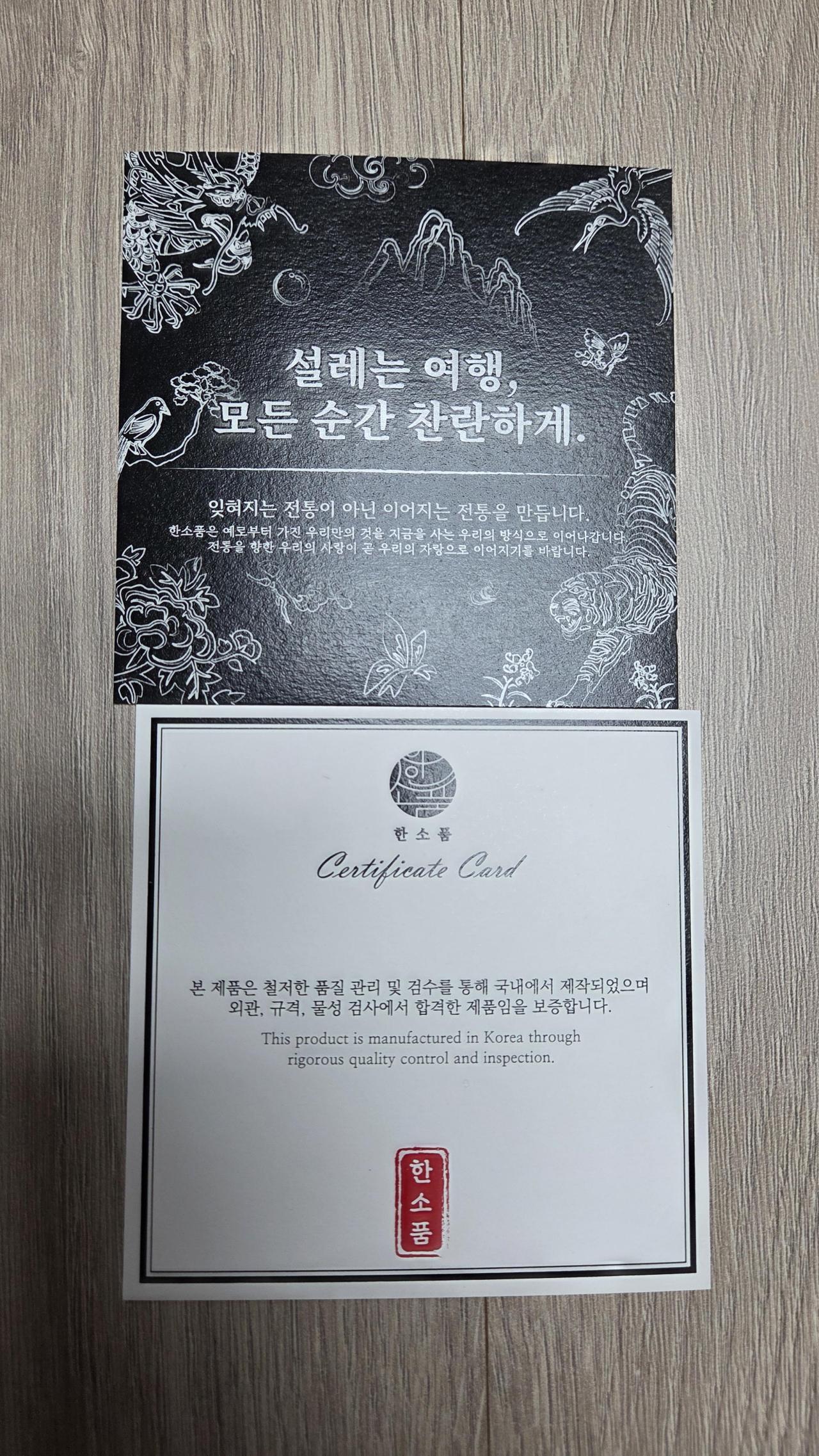 올해 2월 친구들과 여행시 사용 및 선물용으로 구입했는데 사정상 전달은 못했으나 이쁘네요.나비 흰색 2개, 블랙 1개, 붉은말 1개 구입했는데 뒷면 디자인은 나비와 말이 틀리네요.여행시 소지하면 눈에 확 들어올것 같네요