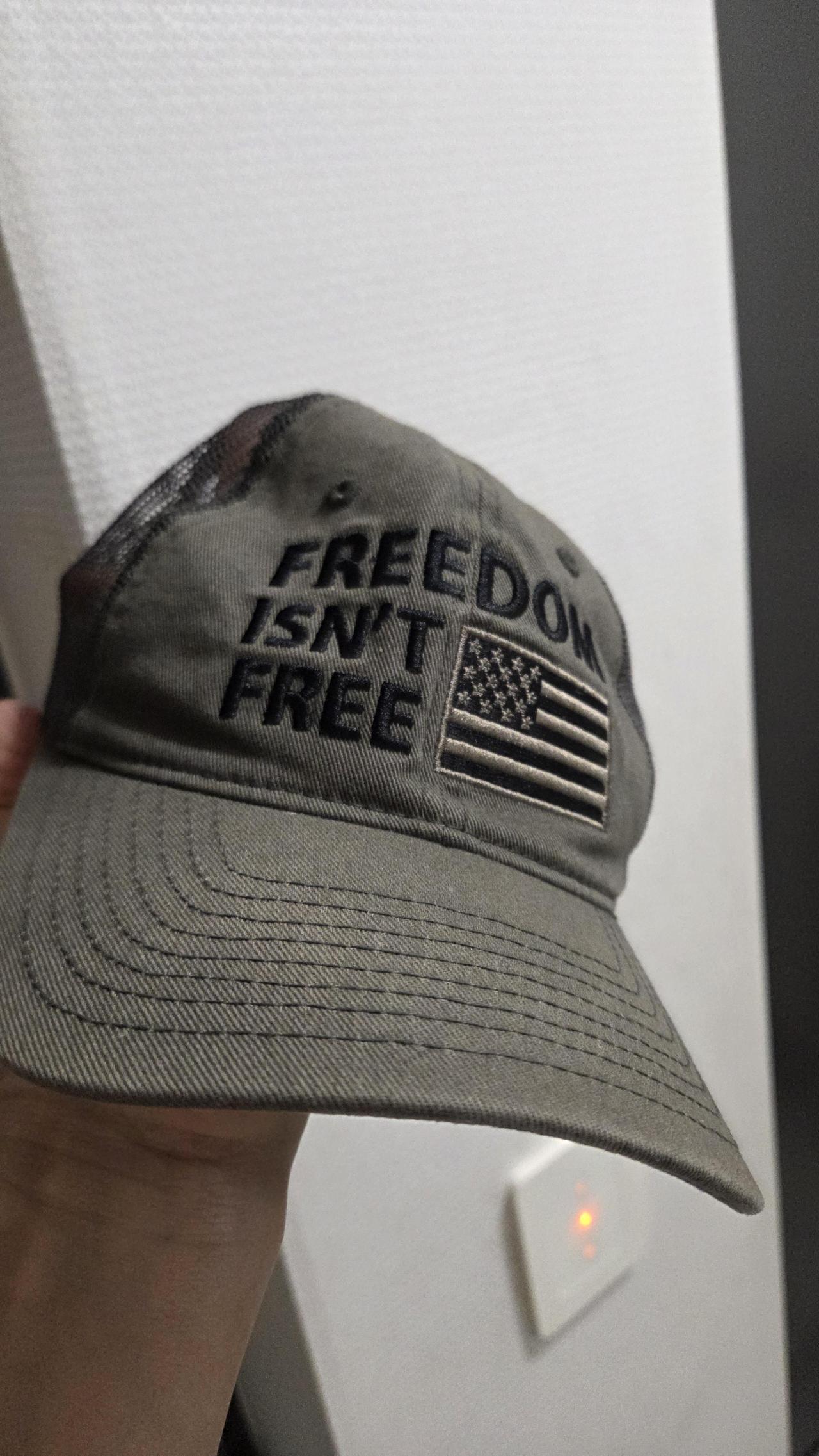 -'대가 없는 자유 없다'라는 문구가 마음에 들어서 쓰게된 모자인데