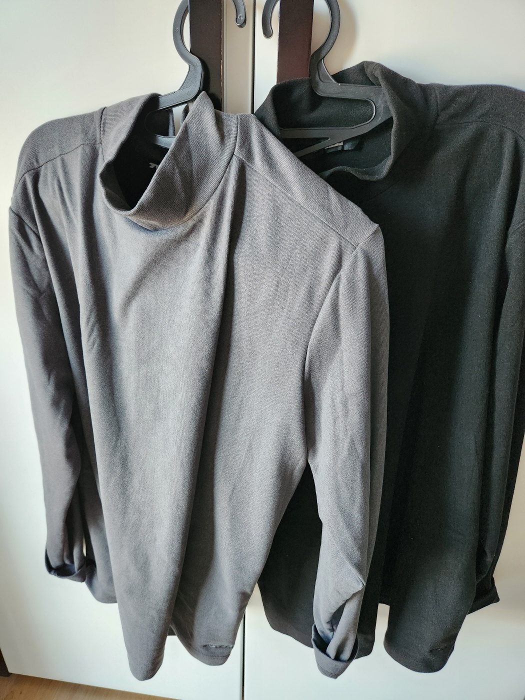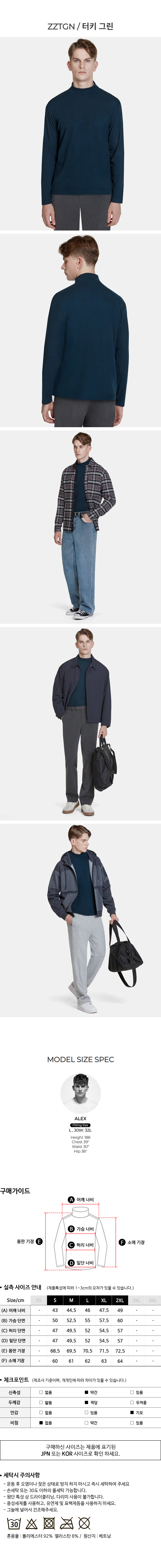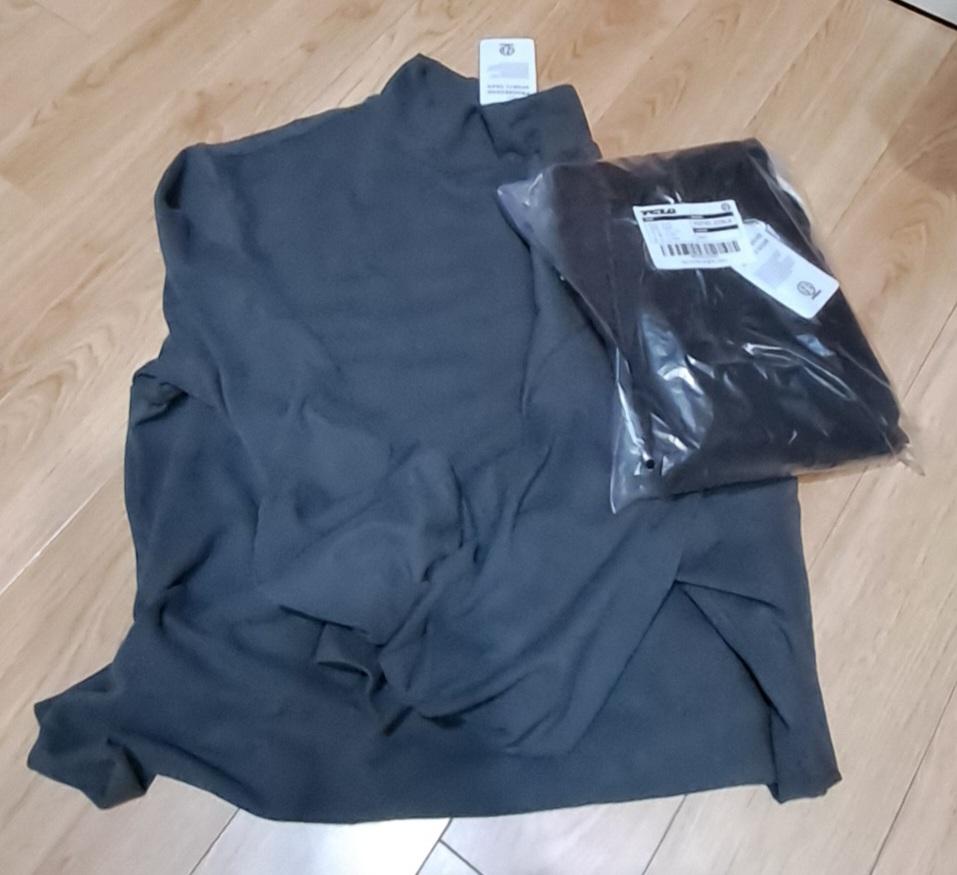 아예 추워지기 전까진 코트 이너로 단품으로도 쓰기 편할 옷이네요. 두께는 티셔츠류보단 두껍지만 겨울 니트보다는 얇은 정도입니다. 모크넥이라 이너웨어로 입어도 부담스럽지 않네요. 기모가 겉에도 있다 보니 살짝 뻣뻣한데 신축성은 좋은 편입니다.
